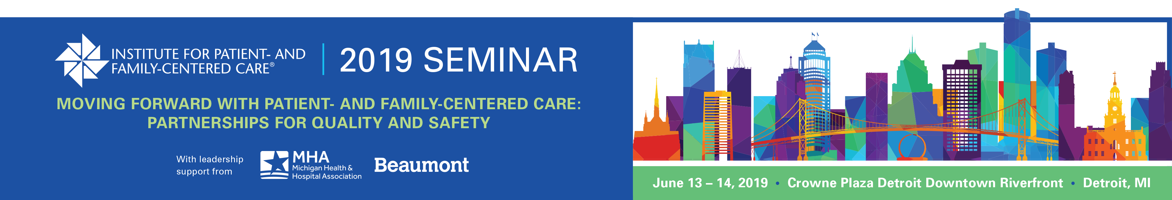 ![]() Don't Miss IPFCC's Intensive Seminar in Michigan IPFCC’s next intensive seminar, Moving Forward with Patient- and Family-Centered Care: Partnerships for Quality & Safety, offers a unique opportunity to take your organization to the next level with patient- and family-centered care! With leadership support from the MHA Keystone Center and Beaumont Health, the seminar will be held on June 13-14, 2019 at the Crowne Plaza Detroit Downtown Riverfront Hotel. Learn More and Register Now |